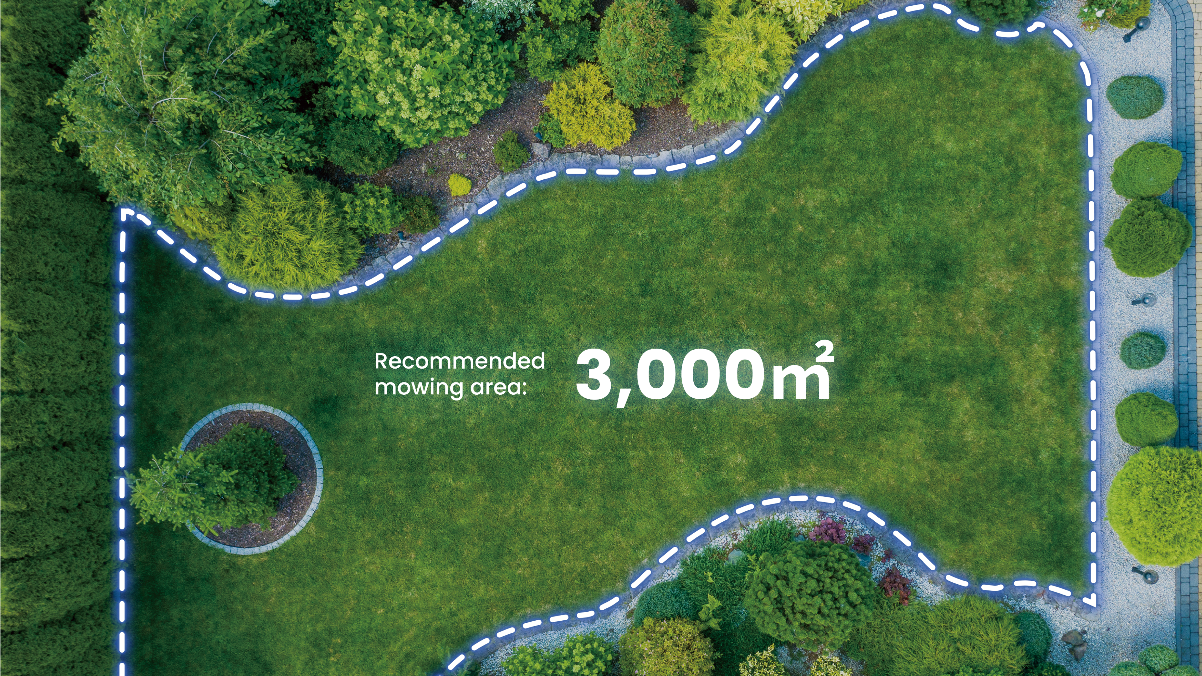 Der Mähroboter FL3000 ist für Flächen bis zu 3.000 m² (0,75 Acre) ausgelegt und somit ideal für mittelgroße bis große Rasenflächen und weitläufige Gärten.